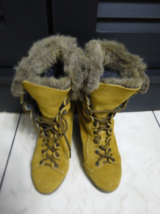 優寶購物《ubao.Tw》特貨品商城,黑貓宅配,取貨付款,近全新 Steve Madden 真皮土黃色麂皮毛茸茸保暖楔型高跟綁帶軍靴37號 | Yahoo拍賣