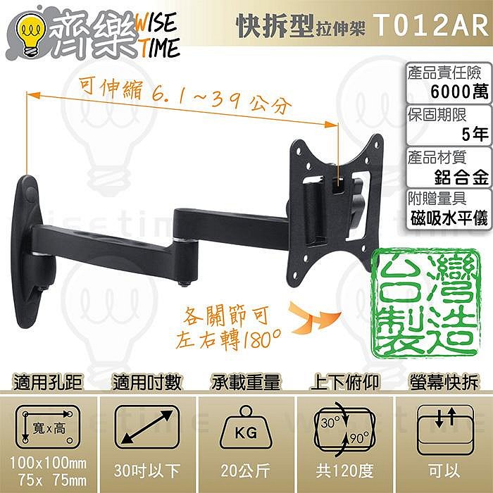 優寶購物《ubao.Tw》特貨品商城,黑貓宅配,取貨付款,齊樂台北~30吋以下快拆型鋁合金壁掛架.螢幕架T012AR(台製)-可前後拉伸/旋轉180度/俯30仰90度/保固5年 | Yahoo拍賣