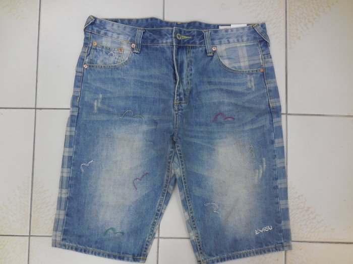 優寶購物《ubao.Tw》特貨品商城,黑貓宅配,取貨付款,(二手)EVISU藍色刷色磨破 牛仔休閒短褲(W34)(B408) | Yahoo拍賣