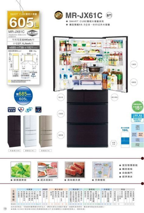 優寶購物《ubao.Tw》特貨品商城,黑貓宅配,取貨付款,限區配送+基本安裝*元元家電館*MITSUBISHI 三菱 日本原裝605公升六門冰箱 MR-JX61C | Yahoo拍賣