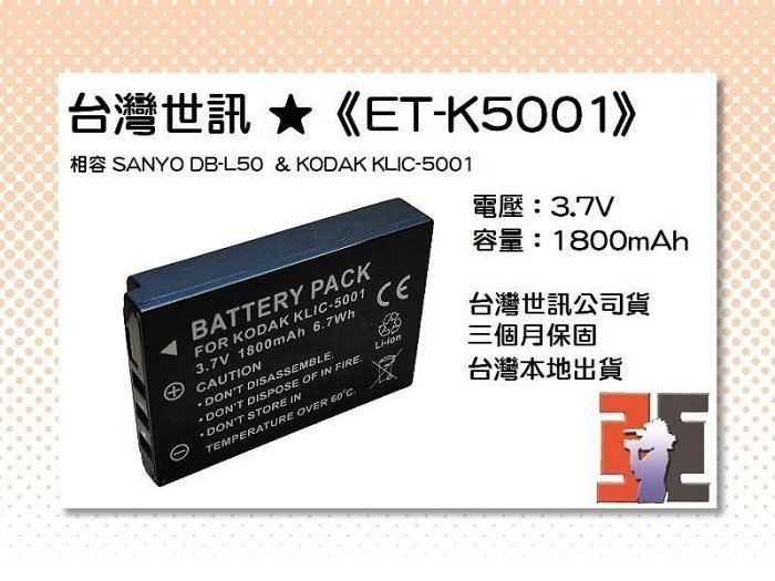 優寶購物《ubao.Tw》特貨品商城,黑貓宅配,取貨付款,【老闆的家當】台灣世訊ET-K5001 副廠電池(相容 SANYO DB-L50 電池) | Yahoo拍賣