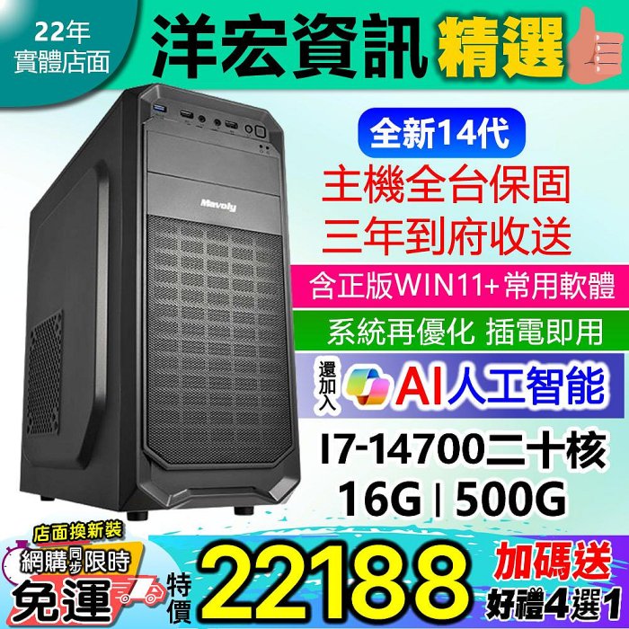 優寶購物《ubao.Tw》特貨品商城,黑貓宅配,取貨付款,【22188元】全新14代I7-14700電腦主機16G/500G/480W含WIN11+安卓系統插電即用可刷卡分期台南洋宏資訊全台收送保固 | Yahoo拍賣