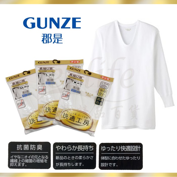 優寶購物《ubao.Tw》特貨品商城,黑貓宅配,取貨付款,【e2life】日本製郡是 Gunze 男士純棉U領長袖內衣/ 衛生衣 # KH3010 LL | Yahoo拍賣