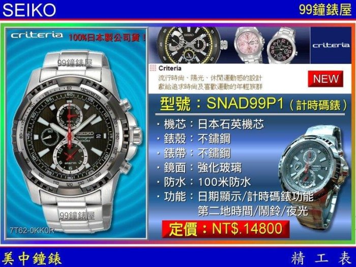 優寶購物《ubao.Tw》特貨品商城,黑貓宅配,取貨付款,【99鐘錶屋】SEIKO精工錶:〈Criteria系列〉(SNAD99P1)計時碼錶 / 不銹鋼紅指針SK004 | Yahoo拍賣