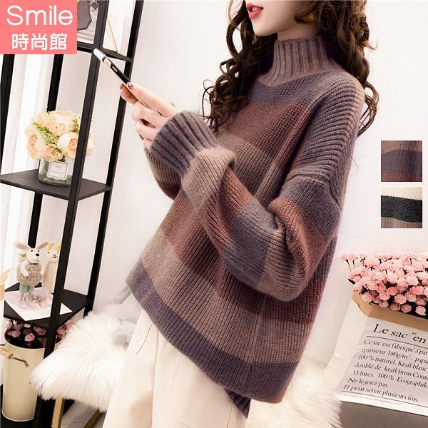 優寶購物《ubao.Tw》特貨品商城,黑貓宅配,取貨付款,【V3284】SMILE-慵懶風‧條紋拼色半高領針織長袖上衣 | Yahoo拍賣