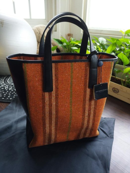 優寶購物《ubao.Tw》特貨品商城,黑貓宅配,取貨付款,Burberry 英倫風格黑皮革橘色毛呢大型提包 | Yahoo拍賣