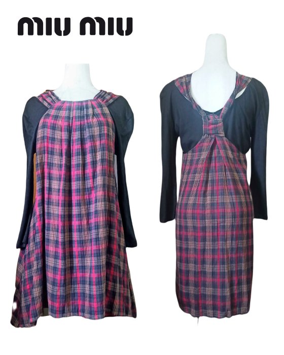 優寶購物《ubao.Tw》特貨品商城,黑貓宅配,取貨付款,歐系名牌~【MIU MIU】黑色上衣外罩紅棕格紋裙 後扭結設計假兩件洋裝~ AU4 | Yahoo拍賣