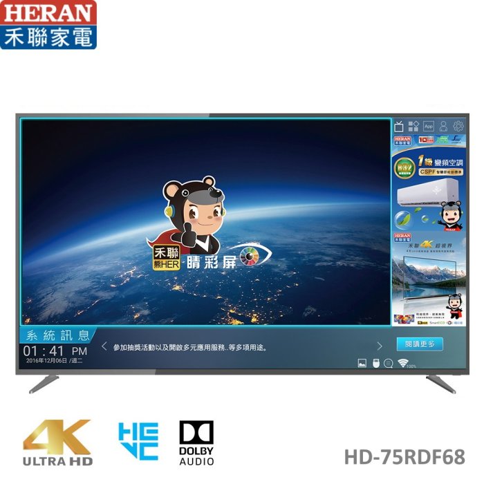 優寶購物《ubao.Tw》特貨品商城,黑貓宅配,取貨付款,鑫冠鑫↘禾聯HERAN HD-75RDF68 75吋 聲控 4K智慧連網 低藍光液晶顯示器/電視/TV(視訊盒) | Yahoo拍賣