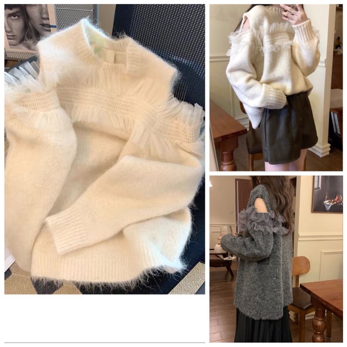 優寶購物《ubao.Tw》特貨品商城,黑貓宅配,取貨付款,🌸木耳網紗花邊拼接露肩毛衣 | Yahoo拍賣