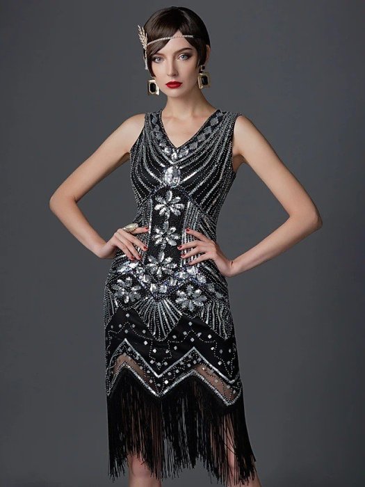 優寶購物《ubao.Tw》特貨品商城,黑貓宅配,取貨付款,F20234 S~4XL號 閃亮亮片流蘇V領復古派對舞會無袖中長裙洋裝禮服 白黑藍銀綠金6色 | Yahoo拍賣