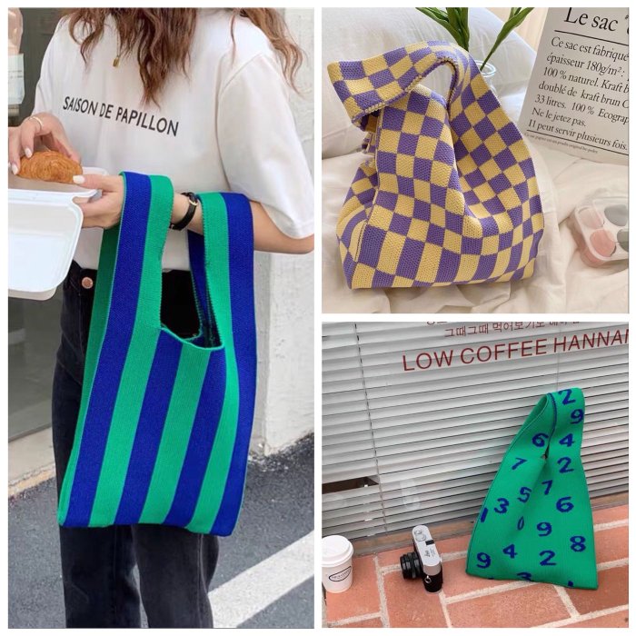 優寶購物《ubao.Tw》特貨品商城,黑貓宅配,取貨付款,韓國多款💚撞色 條紋 棋盤格 數字 針織手提包 | Yahoo拍賣