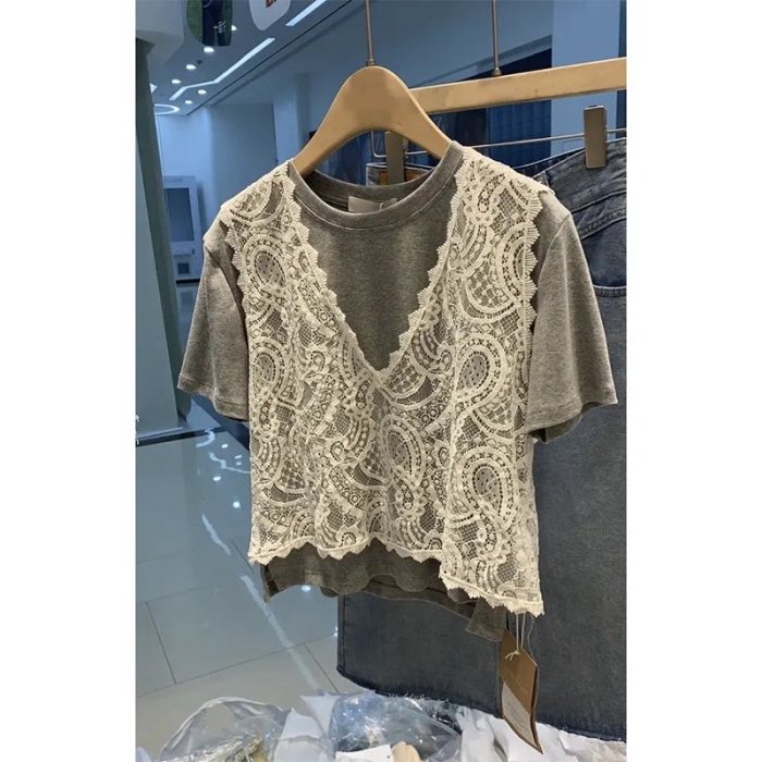 優寶購物《ubao.Tw》特貨品商城,黑貓宅配,取貨付款,兩件套🌸V領蕾絲鏤空疊穿背心+純色休閒短袖T恤 | Yahoo拍賣
