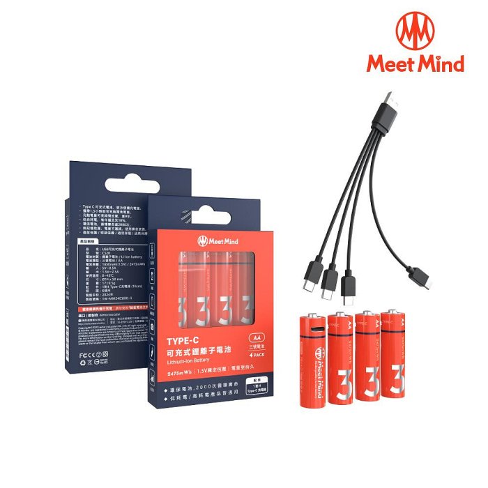 優寶購物《ubao.Tw》特貨品商城,黑貓宅配,取貨付款,Meet Mind USB C AA/3號 可充電式鋰電池4入一卡 附1對4充電線 低自耗 過放保護 過熱保護 | Yahoo拍賣