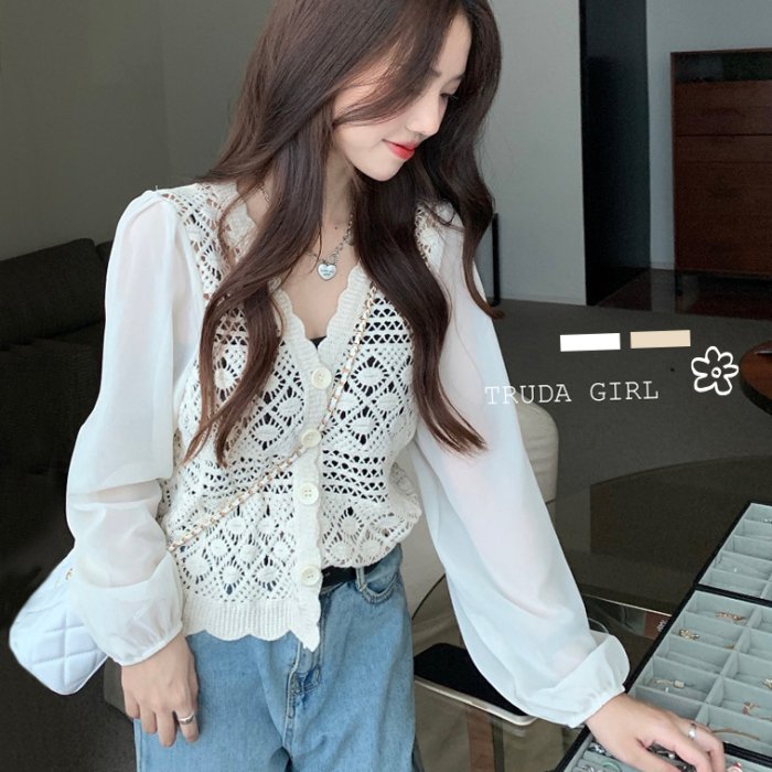 優寶購物《ubao.Tw》特貨品商城,黑貓宅配,取貨付款,《杜達女孩》喚醒浪漫的鈎花蕾絲拼接雪紡長袖上衣 泡泡袖V領排釦長袖上衣 燈籠袖 鏤空蕾絲 假兩件上衣 針織上衣 雪紡上衣 | Yahoo拍賣
