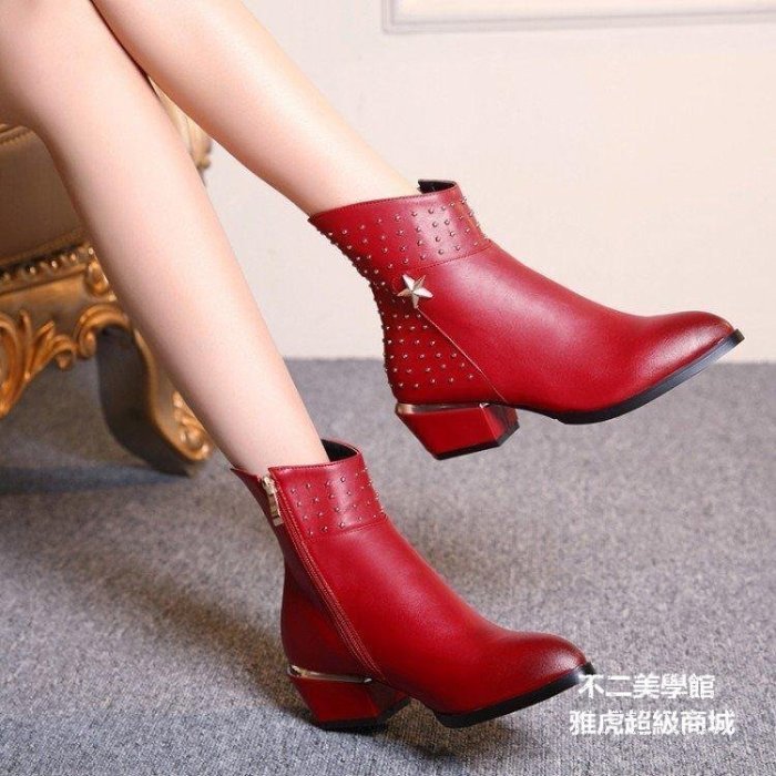 優寶購物《ubao.Tw》特貨品商城,黑貓宅配,取貨付款,【格倫雅】~秋冬女鞋真皮靴子英倫鉚釘尖頭短靴女中跟粗跟馬丁靴紅色25656[g-l-y04促銷 正品 現貨 | Yahoo拍賣