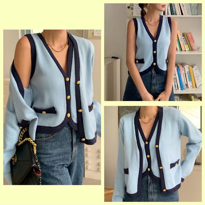優寶購物《ubao.Tw》特貨品商城,黑貓宅配,取貨付款,正韓 3色☝🏻💕氣質V領排扣v領背心+撞色包邊長袖針織外套 | Yahoo拍賣
