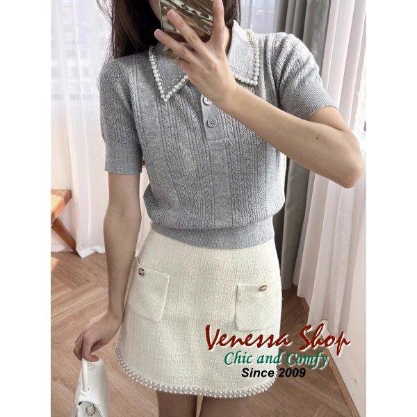 優寶購物《ubao.Tw》特貨品商城,黑貓宅配,取貨付款,VENESSA~ 美翻了小香風珍珠燙鑽 法國 SDR 新款 女の修身Polo領羊毛絨短袖針織衫T恤上衣 (G1646) | Yahoo拍賣