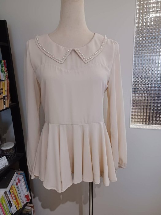 優寶購物《ubao.Tw》特貨品商城,黑貓宅配,取貨付款,LOWRYS FARM ♥日本品牌♥ 米色雪紡 拼接下擺波浪 珍珠領口 蓬袖上衣 | Yahoo拍賣