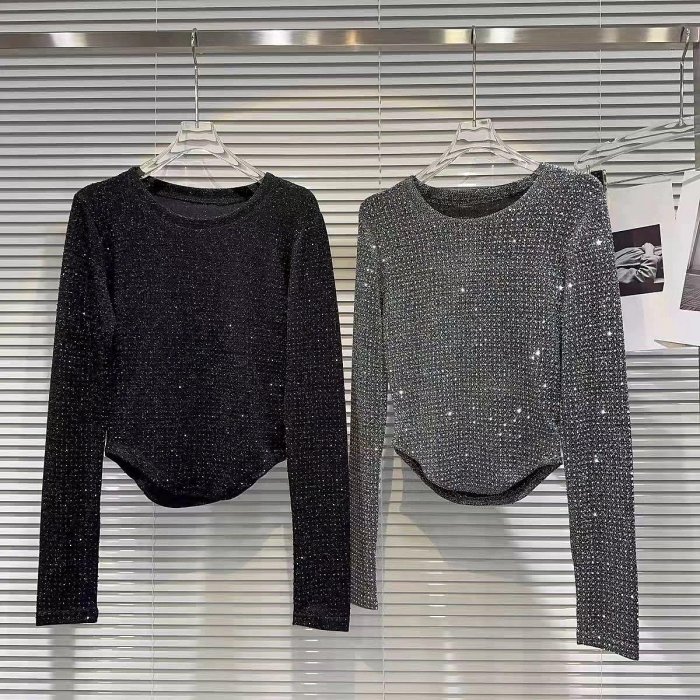 優寶購物《ubao.Tw》特貨品商城,黑貓宅配,取貨付款,閃鑽方領/圓領修身長袖T恤(2色) | Yahoo拍賣