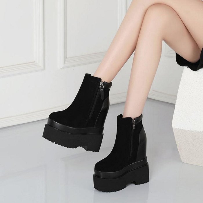 優寶購物《ubao.Tw》特貨品商城,黑貓宅配,取貨付款,【熱賣精選】內增高16cm真皮女靴子超高跟小黑鞋坡跟厚底舒適單靴子松糕馬丁靴#有家精品店 | Yahoo拍賣
