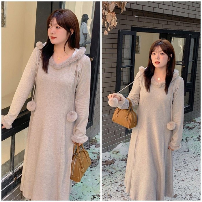 優寶購物《ubao.Tw》特貨品商城,黑貓宅配,取貨付款,大尺碼連身裙大碼針織洋裝🎶可愛毛球裝飾柔軟連帽連身裙✔️收腰版型超顯瘦✔️內裡保暖加絨2️⃣色可選💕小言家 | Yahoo拍賣