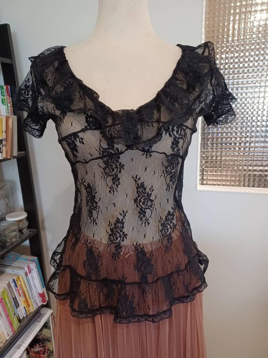 優寶購物《ubao.Tw》特貨品商城,黑貓宅配,取貨付款,iiMK ♥日本品牌♥ 黑色透膚 拼接刺繡 荷葉滾邊領口 短袖上衣 特價550元(不議價) | Yahoo拍賣