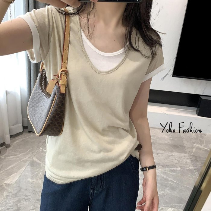 優寶購物《ubao.Tw》特貨品商城,黑貓宅配,取貨付款,YOHO 假兩件天絲T恤 實拍夏季薄款透氣大U領假兩件上衣 (NN089) | Yahoo拍賣