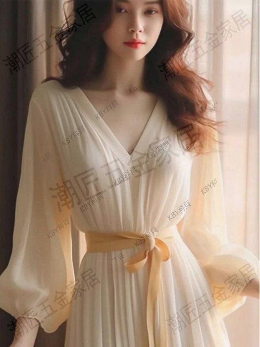 優寶購物《ubao.Tw》特貨品商城,黑貓宅配,取貨付款,奶杏色v領泡泡袖雪紡連衣裙2024春款女裝高端精致絕美禮服長裙子【亞克明燈家居】 | Yahoo拍賣