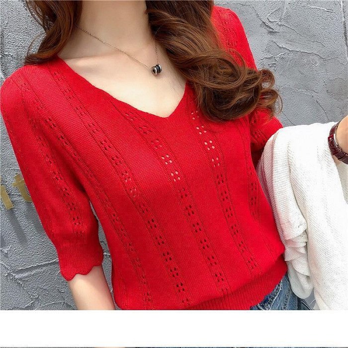 優寶購物《ubao.Tw》特貨品商城,黑貓宅配,取貨付款,【締造】540復古V領鏤空針織衫 短袖 韓版寬松外搭套頭罩衫 中袖上衣 性感鏤空上衣 修身T恤 七分袖針織衫 毛 | Yahoo拍賣