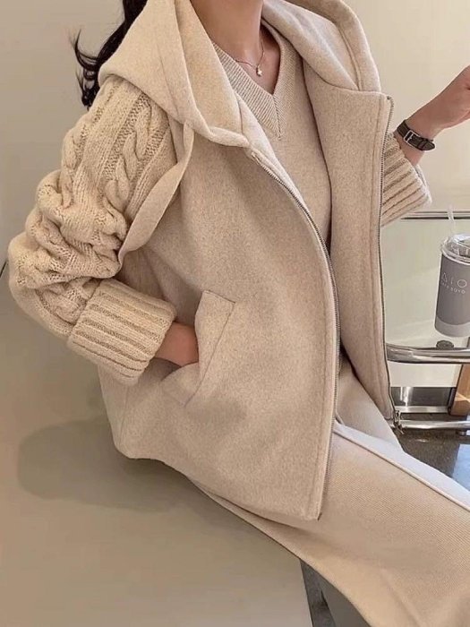 優寶購物《ubao.Tw》特貨品商城,黑貓宅配,取貨付款,正韓🎀 拼接麻花袖子連帽 毛呢外套 | Yahoo拍賣