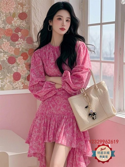 優寶購物《ubao.Tw》特貨品商城,黑貓宅配,取貨付款,明星衣櫃=2025春季新款女裝多巴胺絕美小裙法式氣質玫粉色碎花不規則洋裝連身裙 | Yahoo拍賣