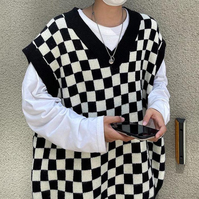 優寶購物《ubao.Tw》特貨品商城,黑貓宅配,取貨付款,V領毛衣背心 男士春秋新款 港風潮流ins棋盤格針織衫上衣服 套頭格子毛衣 寬鬆休閒針織衫(滿599免運) | Yahoo拍賣