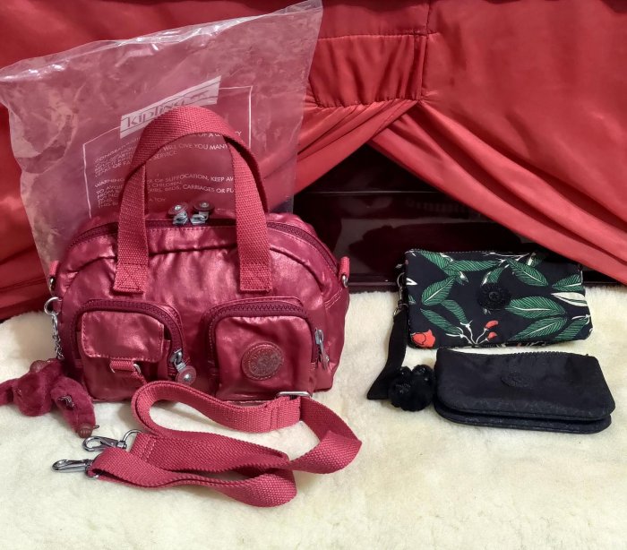 優寶購物《ubao.Tw》特貨品商城,黑貓宅配,取貨付款,二手 猴子Kipling 黑稜格紋印花三夾層配件包黑樹葉 零錢包 手機包 手拿包 紅色手提包 肩斜背包防水包 | Yahoo拍賣