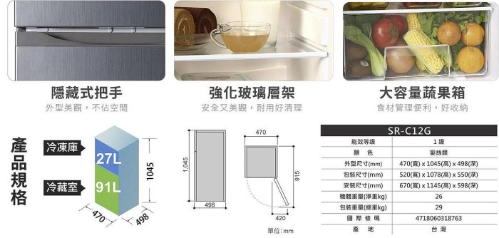 優寶購物《ubao.Tw》特貨品商城,黑貓宅配,取貨付款,SAMPO 聲寶 118公升一級能效定頻雙門冰箱(SR-C12G)~HAO商城 | Yahoo拍賣
