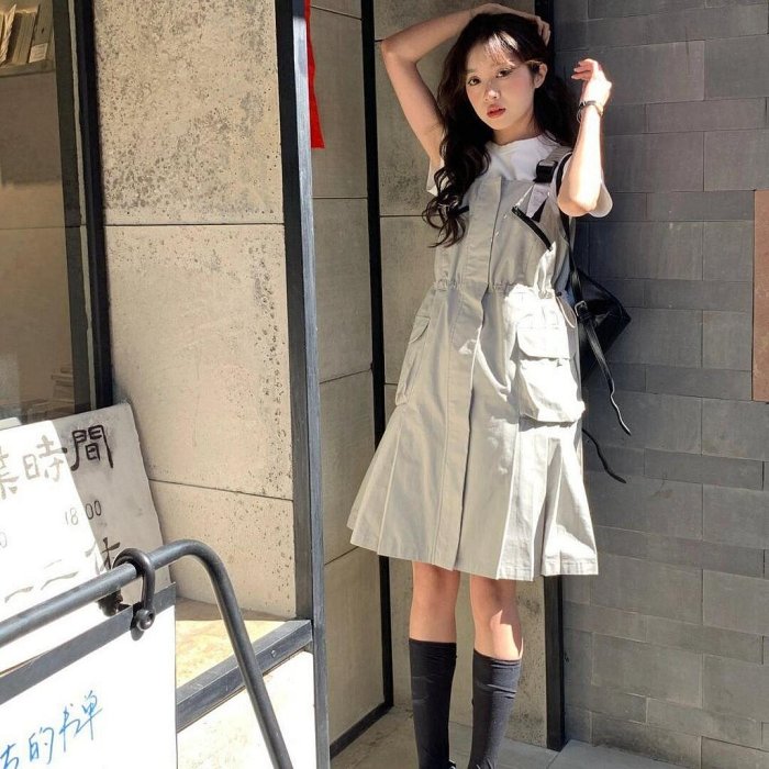 優寶購物《ubao.Tw》特貨品商城,黑貓宅配,取貨付款,【LININ】兩件式套裝女 短袖T恤+灰色工裝揹帶裙女收腰口袋洋裝 | Yahoo拍賣