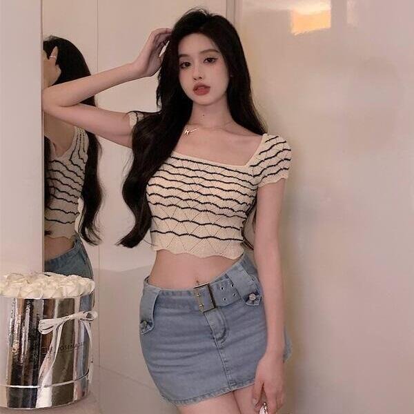 優寶購物《ubao.Tw》特貨品商城,黑貓宅配,取貨付款,薄款條紋方領短袖針織衫女夏季短款修身設計感小眾內搭上衣打底衫流行女裝上衣衣服休閒服丷AB04311 | Yahoo拍賣