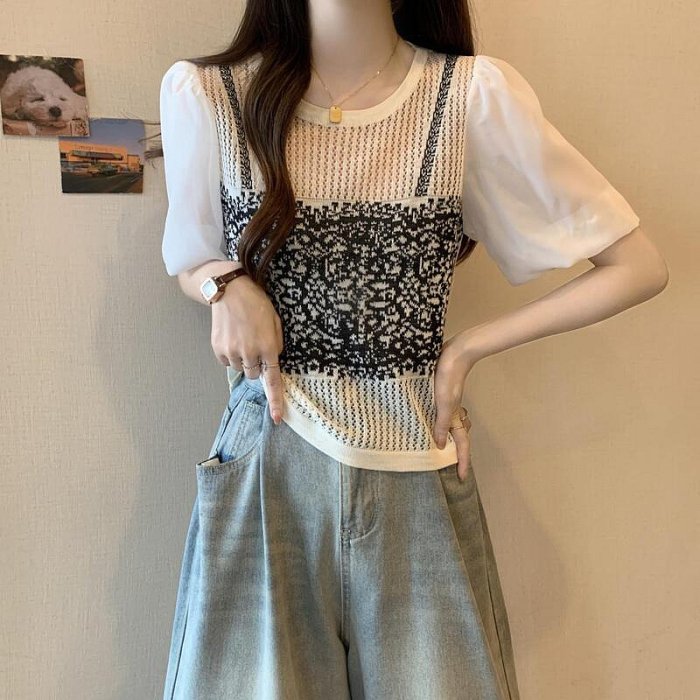 優寶購物《ubao.Tw》特貨品商城,黑貓宅配,取貨付款,假二件蕾絲印花設計感顯瘦百搭短袖針織衫女夏季微透上衣女裝女性服裝流行女裝休閒服飾丷DC11580 | Yahoo拍賣