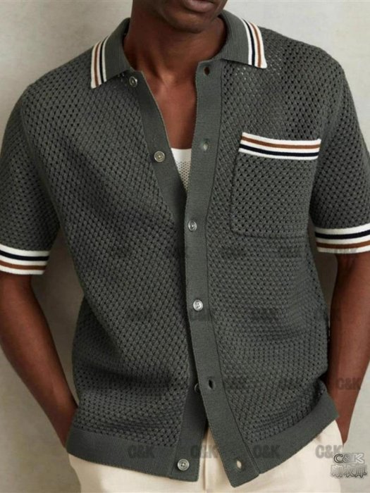 優寶購物《ubao.Tw》特貨品商城,黑貓宅配,取貨付款,潮衣庫『歐洲站男士夏季新款條紋拼接簡約針織開衫潮流舒適鏤空透氣針織衫』針織短袖T恤襯衫POLO衫 | Yahoo拍賣