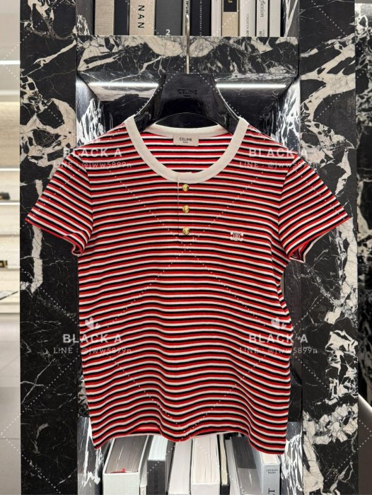 優寶購物《ubao.Tw》特貨品商城,黑貓宅配,取貨付款,【BLACK A】CELINE SS25 TRIOMPHE凱旋門刺繡紅白條紋平紋針織T恤 價格私訊 | Yahoo拍賣