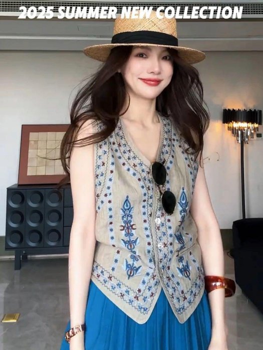 優寶購物《ubao.Tw》特貨品商城,黑貓宅配,取貨付款,民族風 🍬 V領刺繡棉麻坎肩背心 高檔版 | Yahoo拍賣
