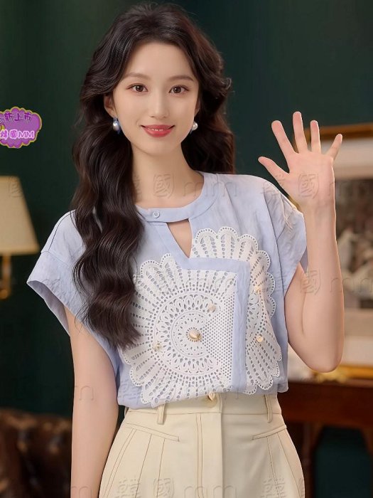 優寶購物《ubao.Tw》特貨品商城,黑貓宅配,取貨付款,韓國MM=文藝復古藍色圓領短袖T恤女夏季新款蕾絲拼接設計感寬松百搭上衣=上衣/短t/打底衫/一字領t/雪紡/襯衫 | Yahoo拍賣