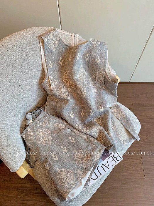 優寶購物《ubao.Tw》特貨品商城,黑貓宅配,取貨付款,老錢風🔆 復古圖騰印花無袖上衣 背心+ 短褲 | Yahoo拍賣