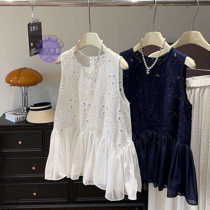 優寶購物《ubao.Tw》特貨品商城,黑貓宅配,取貨付款,日韓服飾=鏤空花朵吊帶背心外穿女蕾絲衫2025夏季大碼胖mm雪紡下擺無袖上衣=無袖襯衫T恤上衣馬甲 | Yahoo拍賣