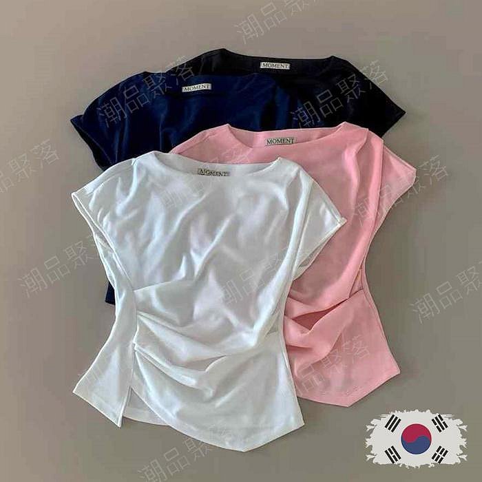優寶購物《ubao.Tw》特貨品商城,黑貓宅配,取貨付款,正韓🇰🇷MOMENT正品 春夏韓國女裝 素色 褶皺 不對稱 一字領 短袖T恤[MM250707-1]~潮品聚落 | Yahoo拍賣