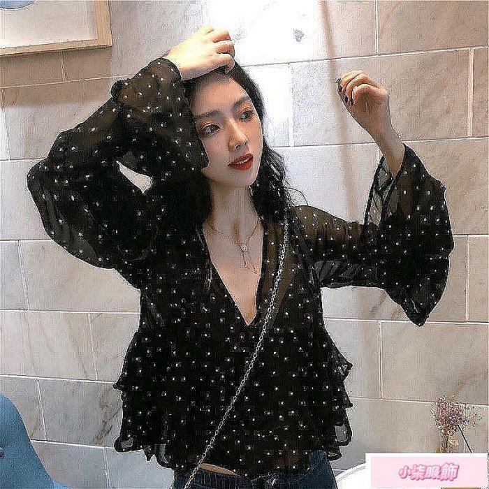 優寶購物《ubao.Tw》特貨品商城,黑貓宅配,取貨付款,【小柒服飾】波點襯衫 女襯衫 雪紡 襯衫 韓風Chic甜美荷葉邊波點微透雪紡衫女V領寬鬆喇叭袖上衣 | Yahoo拍賣