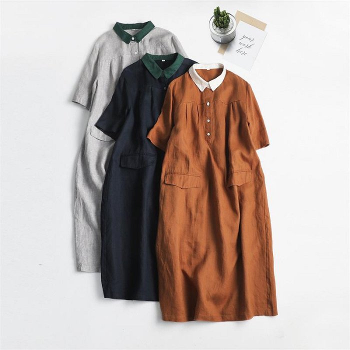 優寶購物《ubao.Tw》特貨品商城,黑貓宅配,取貨付款,特氣質撞色領亞麻短袖襯衫裙夏季女裝文藝百搭連衣裙舒適中長裙 連身裙/洋裝/連衣裙/短袖洋裝 | Yahoo拍賣