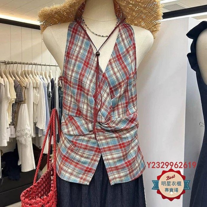 優寶購物《ubao.Tw》特貨品商城,黑貓宅配,取貨付款,明星衣櫃=韓版復古設計小眾扭結掛脖格子背心2025新款洋氣減齡無袖 | Yahoo拍賣