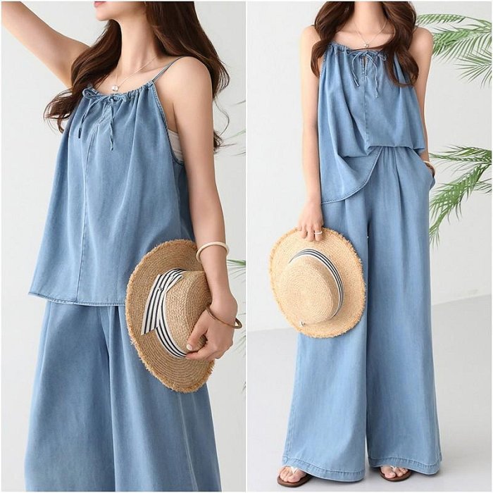 優寶購物《ubao.Tw》特貨品商城,黑貓宅配,取貨付款,Bellee 正韓 夏日度假風 細肩綁帶輕牛仔背心+腰鬆緊輕牛仔寬褲 套裝 (2色)【0709-12】 | Yahoo拍賣