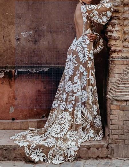 優寶購物《ubao.Tw》特貨品商城,黑貓宅配,取貨付款,§§§ aMOre §§§ 優雅性感大露背 波西米亞花卉圖騰緹花刺繡泡泡公主袖高腰魚尾連身長洋裝~超值 追加 | Yahoo拍賣