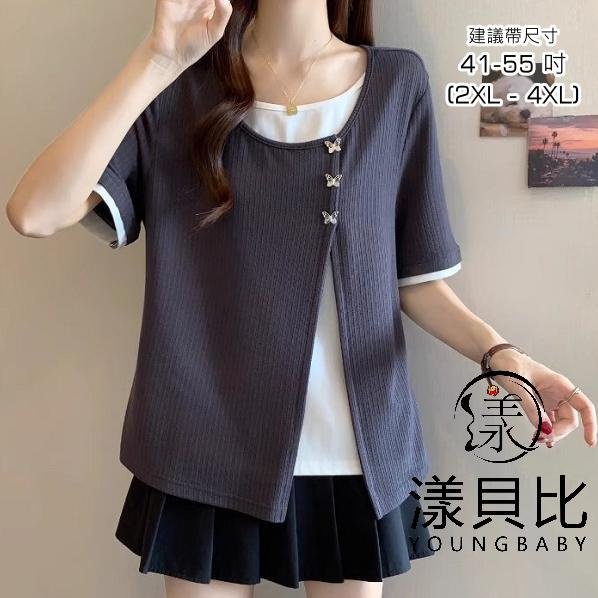 優寶購物《ubao.Tw》特貨品商城,黑貓宅配,取貨付款,漾貝比【9155595】中大尺碼女裝 圓領白T蝴蝶釦灰色背心假兩件式上衣(40-55) | Yahoo拍賣